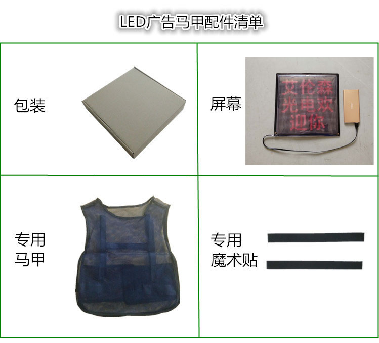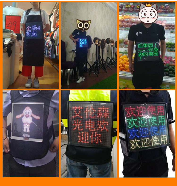 LED馬甲屏LED背心屏產(chǎn)品優(yōu)勢: 1.可隨時隨地發(fā)布內(nèi)容,立刻投入宣傳,商家精準引流,擴大廣告覆蓋范圍。 2.形式新穎,技術(shù)創(chuàng)新,大大提升瞬間曝光機會,吸引顧客眼球,增加客流量。 3.可移動,可穿戴,就是行走中的廣告屏。圖片、文字、動畫并茂,生動鮮艷! 4.讓你成為傍晚人群密集區(qū)的明星,無需燈光和舞臺,不說話也能萬人矚目,天越黑,你越亮!